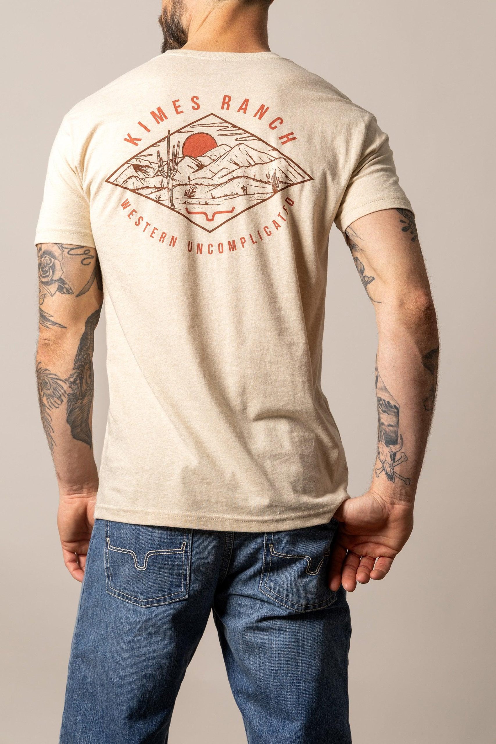 This men’s tee features a bold desert landscape graphic on the back—sun. sand. and silhouettes that speak to the soul of the Southwest. With a clean front and a soft. durable fit. it’s made for those who carry the spirit of the desert wherever they go.