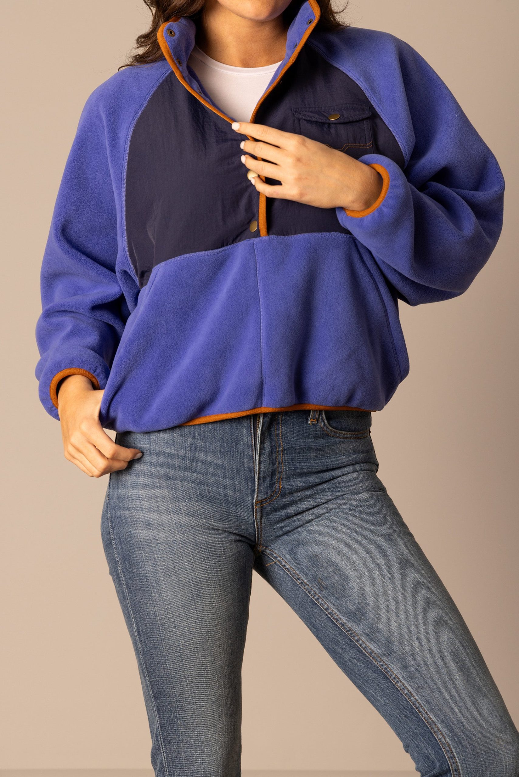 The Josie Fleece is a relaxed and refined polar fleece jacket made for chilly days. Featuring a bold colorblocked yoke and front panel. this cozy layer adds a pop of western style to any outfit. The four-button placket and high collar offer adjustable warmth. while the snap-button chest pocket with the embroidered Longhorn logo adds both function and flair. Finished with durable Taslan trim at the seams. the Josie combines practicality. comfort. and Kimes Ranch signature style.