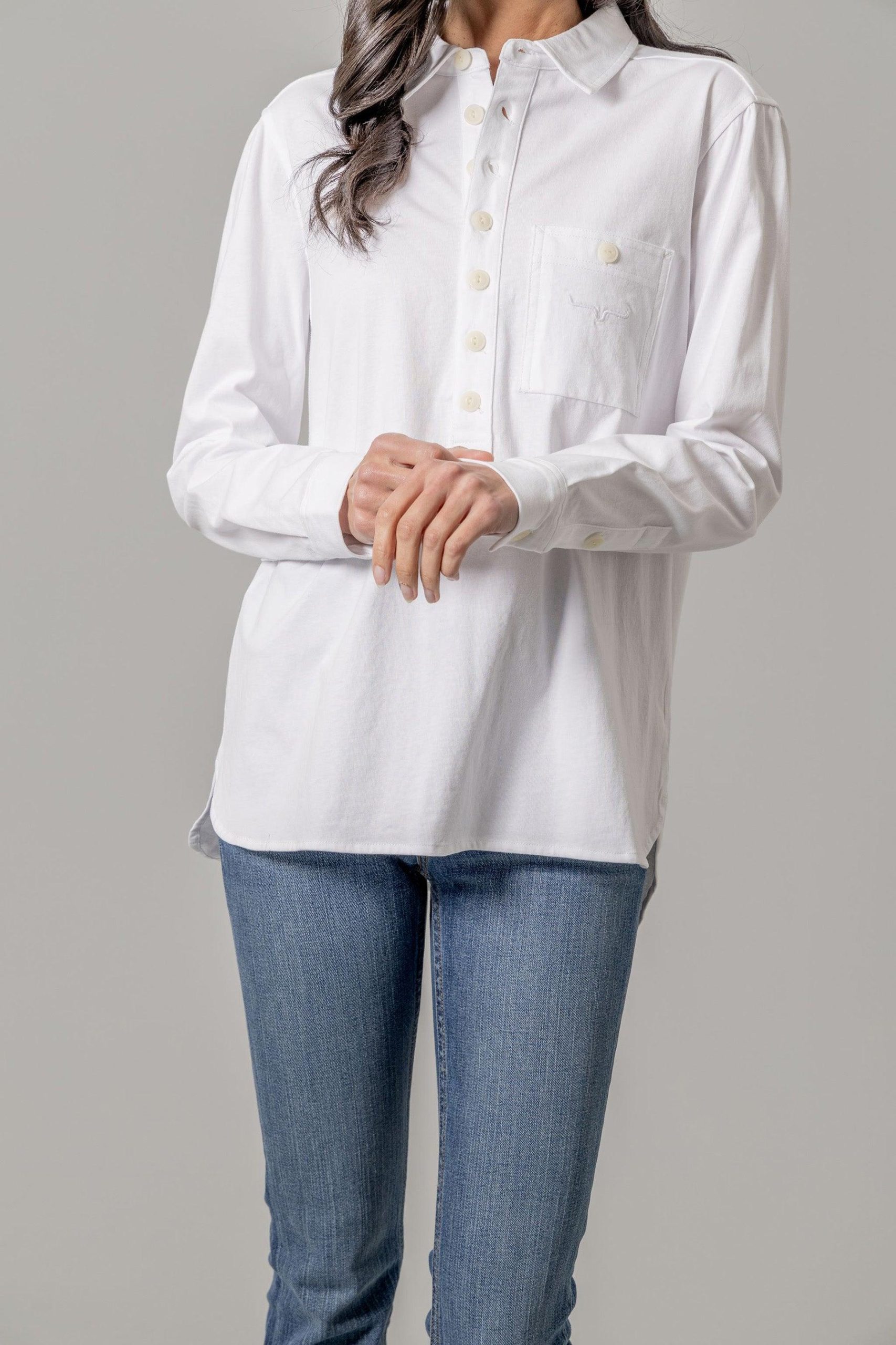 Meet the denim shirt that redefines casual and cool. This shirt has a western yoke with double chest pockets. and a 3/4 button placket to customize the neckline. The subtle high-low hem adds a touch of trendy asymmetry. Crafted from soft yet structured jersey denim. the Judith provides the perfect balance between relaxed comfort and modern western style.