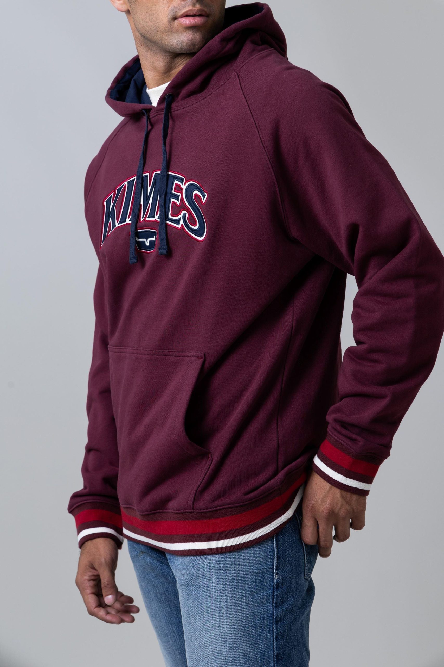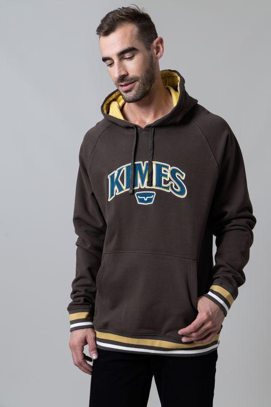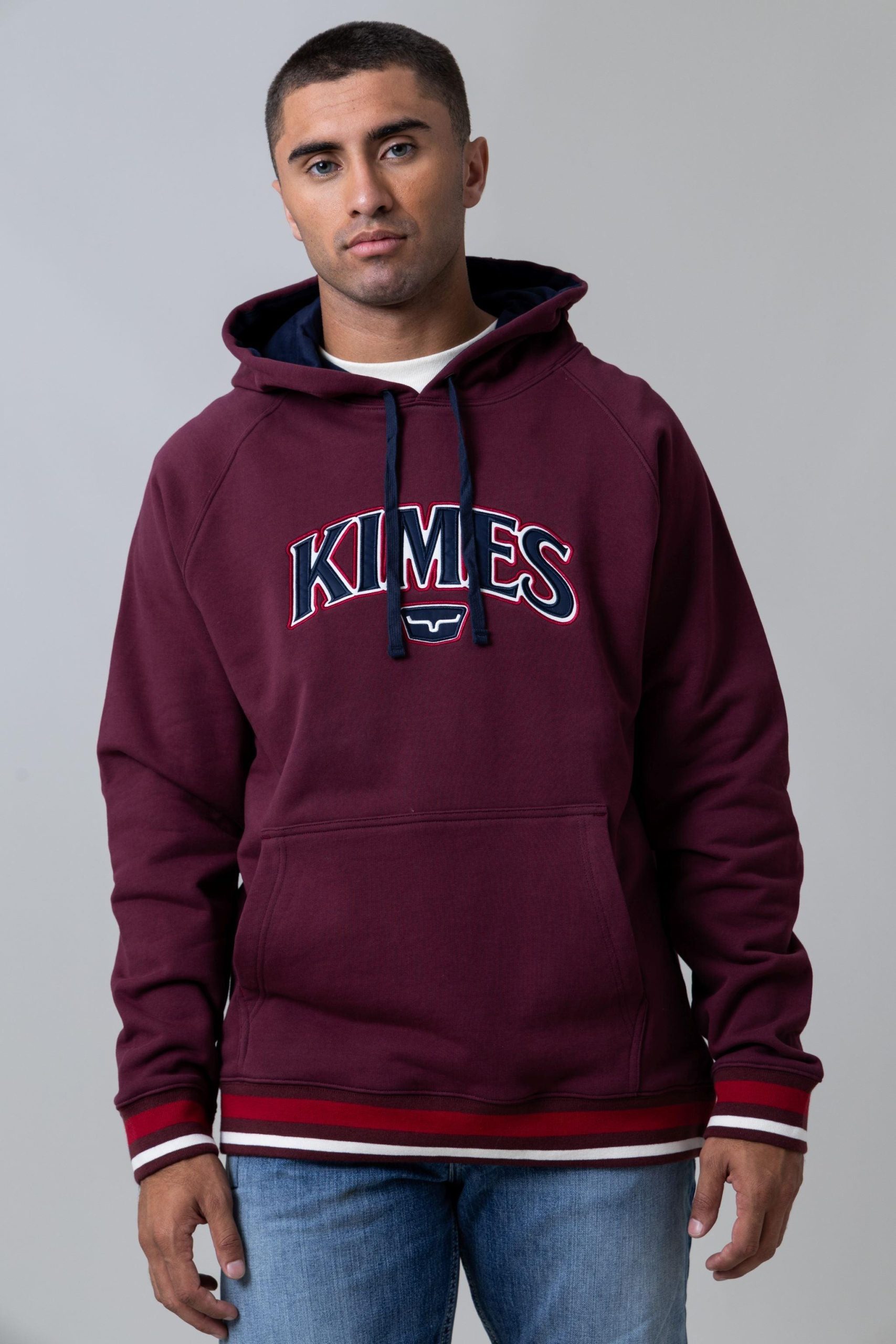 The Kubo Hood – a heavy weight French terry hoodie with a vibrant striped bottom and hand ribbing for that extra flair. This piece features Kimes on the chest. complemented by a horn logo underneath. adding a touch of Western charm to your casual look.