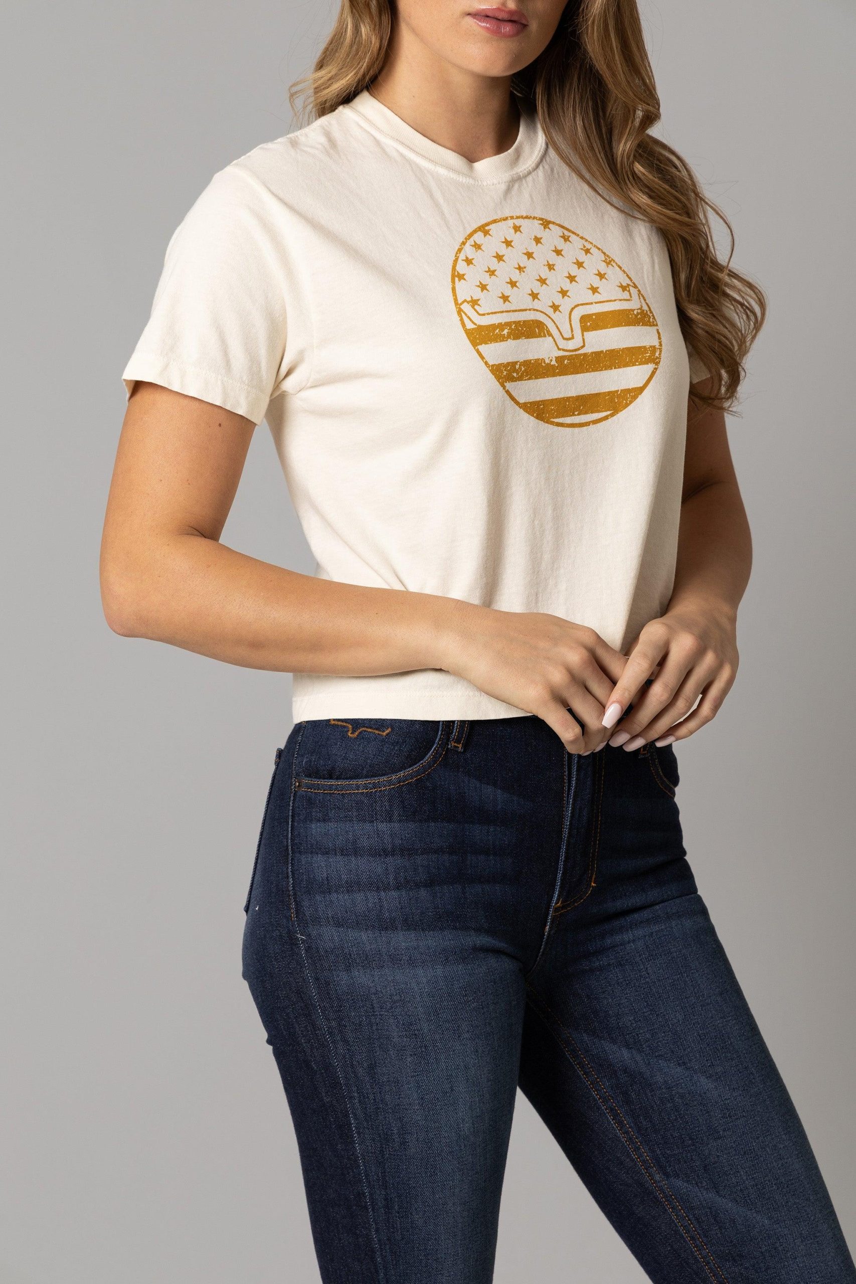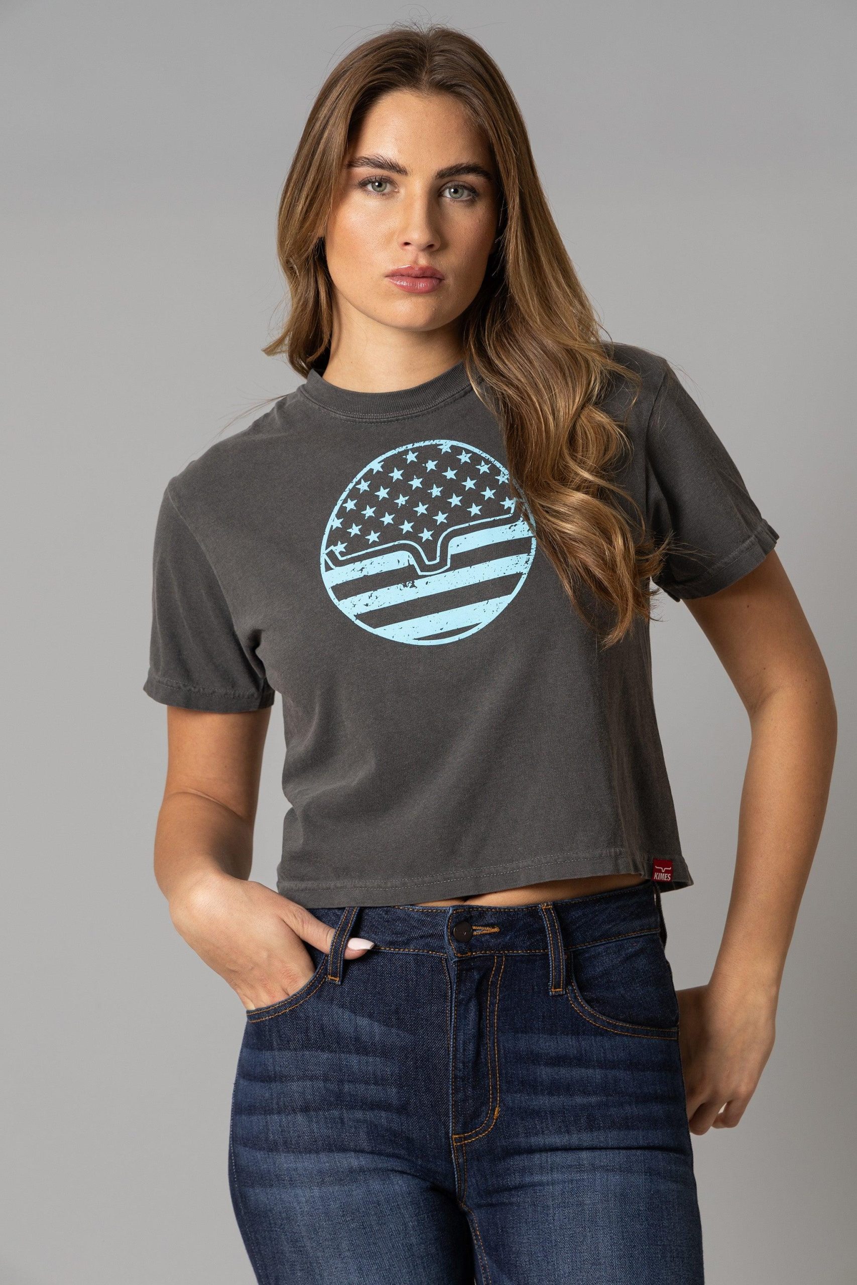 This cropped crew neck features an eye-catching graphic: a bold American flag design reimagined in a circle. and the iconic Kimes Ranch longhorn logo proudly takes center stage within the flag. showcasing love for both country and ranch life. Made from a soft. lightweight fabric. this patriotic cropped tee is perfect for the hotter months.