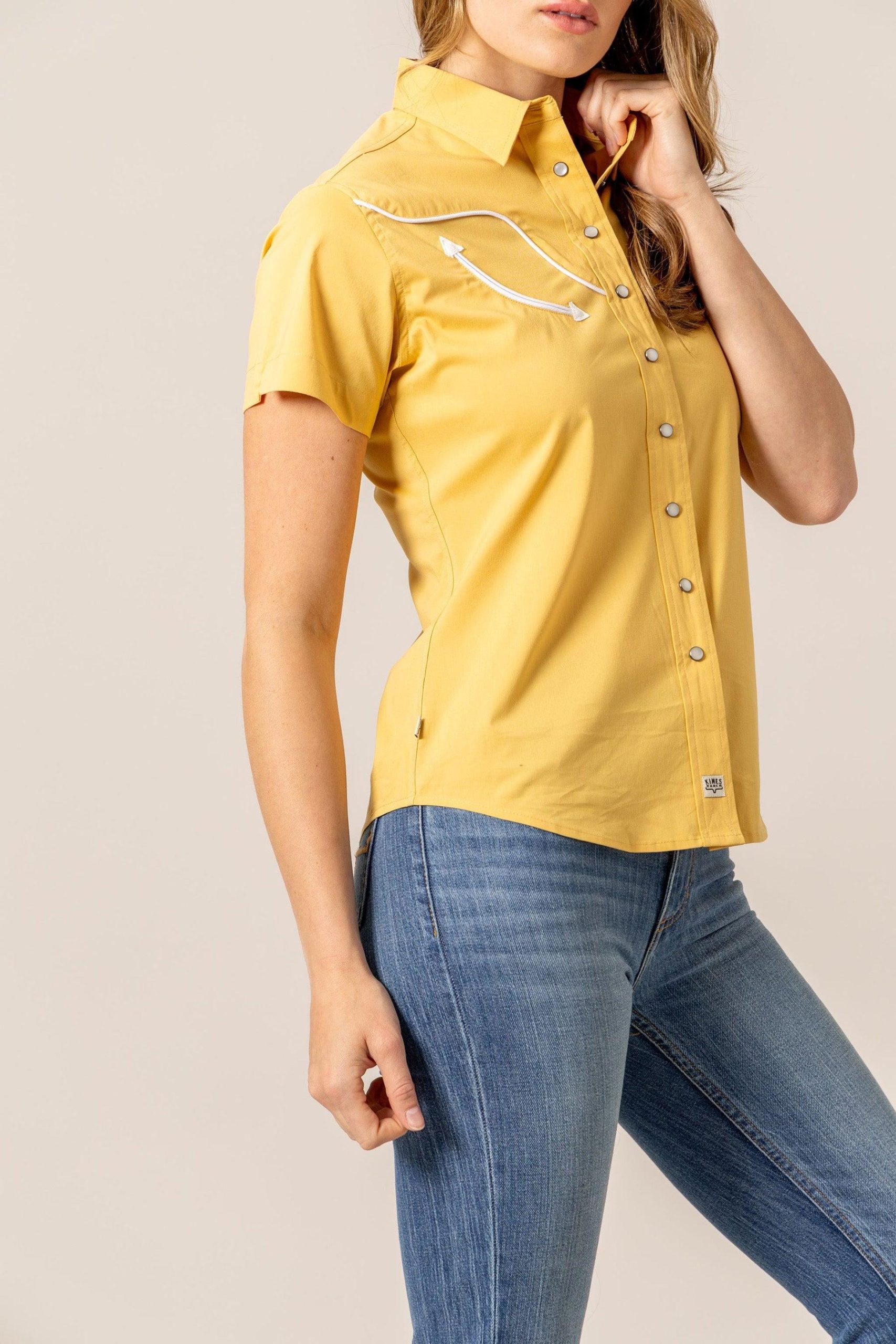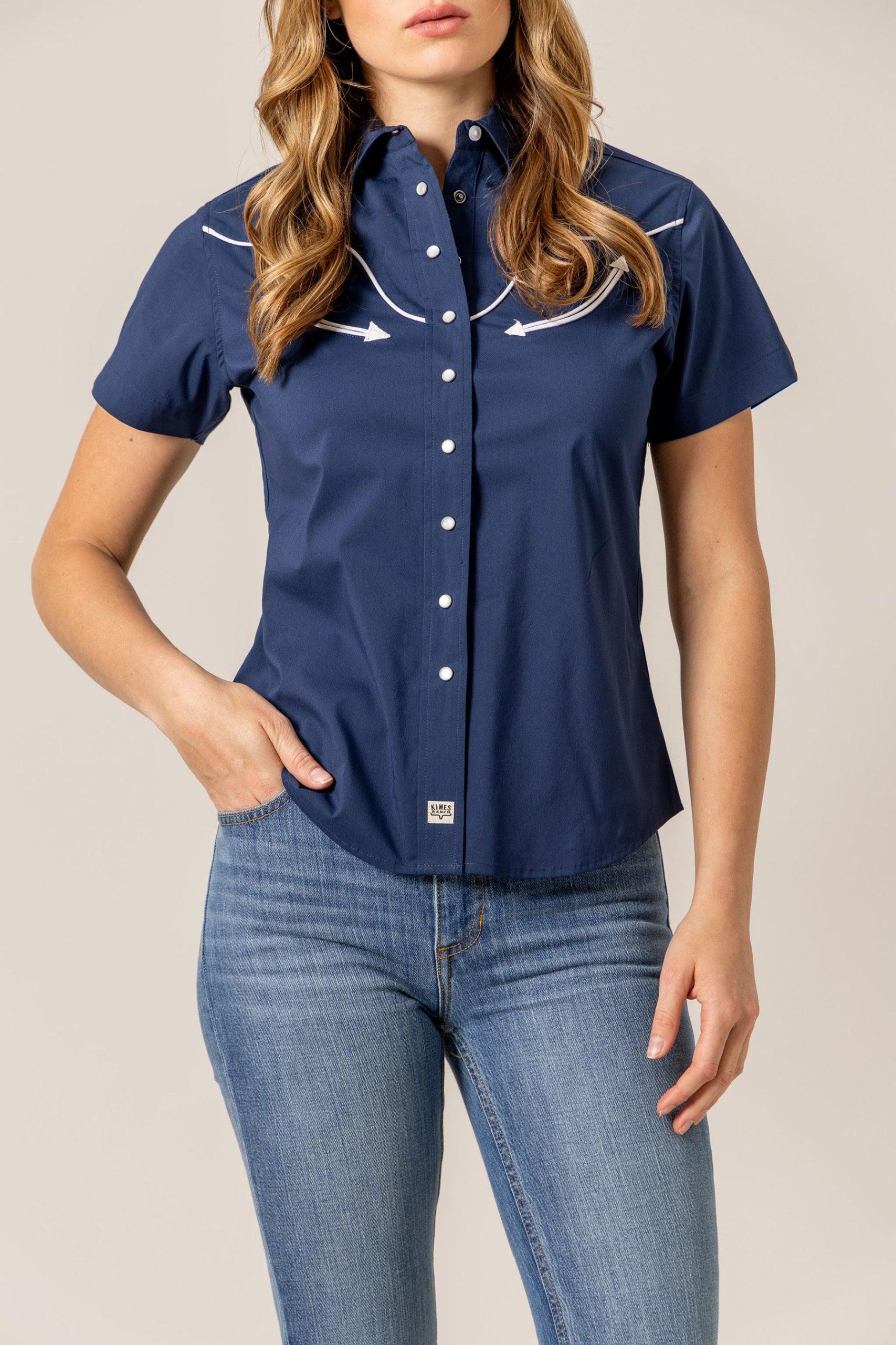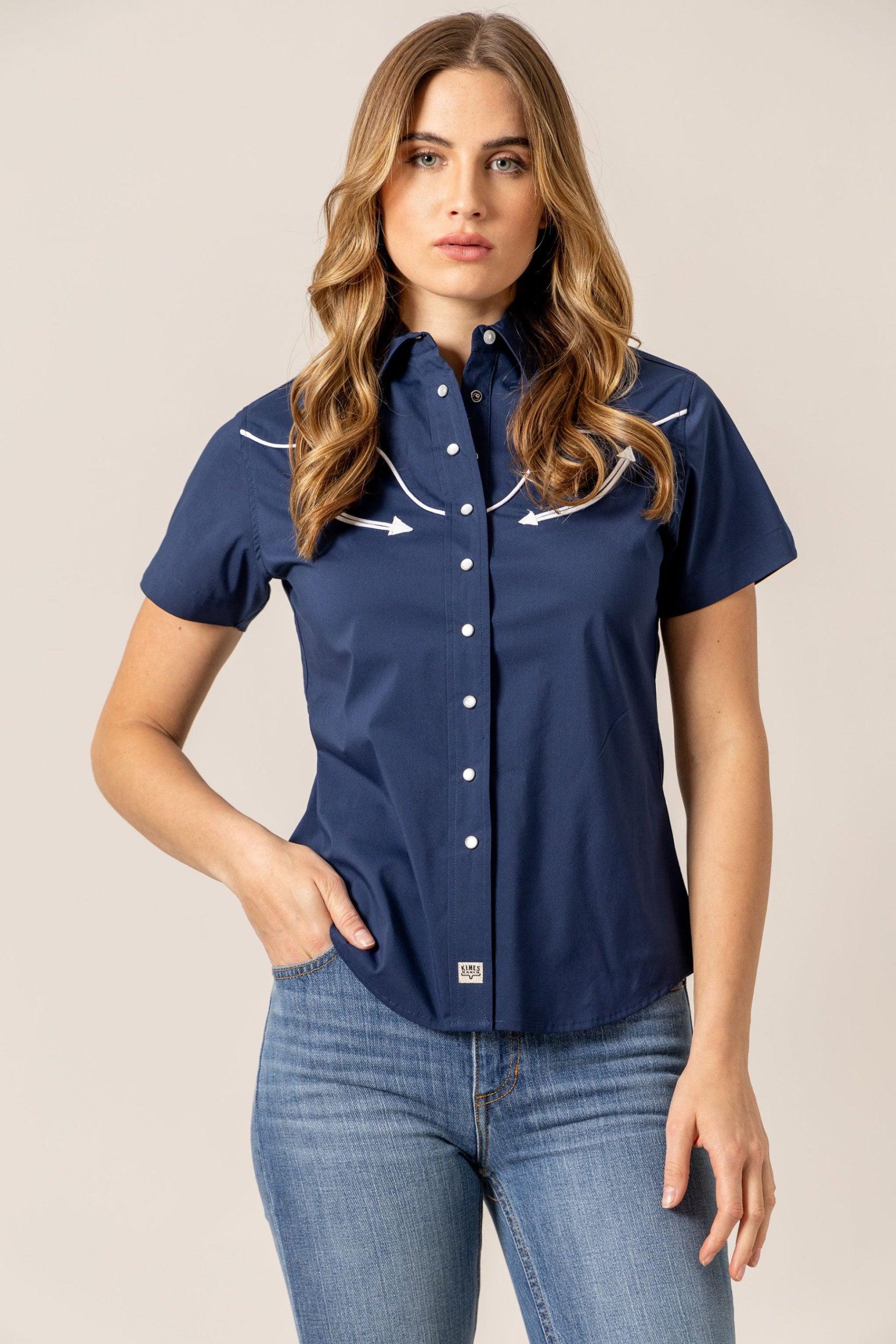 Talk about style! The Logo Horn Snap is the shirt that blends timeless western details with modern comfort. This unique piece features a hidden surprise. a longhorn logo incorporated into the yoke. and vintage-inspired arrows at the front. This fitted women’s short sleeve button-up will never get old.