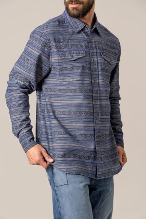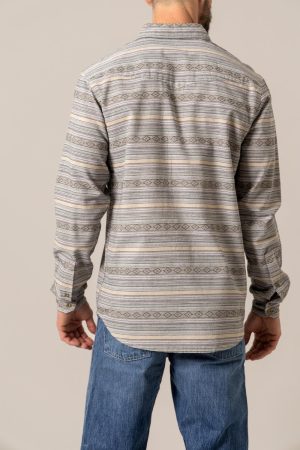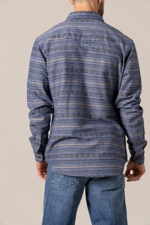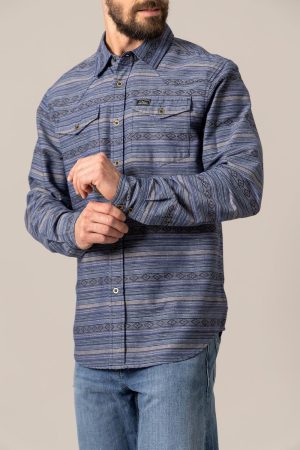 A men’s striped button-up. the Ortega features a subtle and timeless fine horizontal stripe pattern. making this shirt perfect for adding a touch of visual interest to your everyday look. The fit is relaxed and long. and the button front closure and matching button pockets make this shirt comfortable and secure. This shirt is durable without sacrificing style.