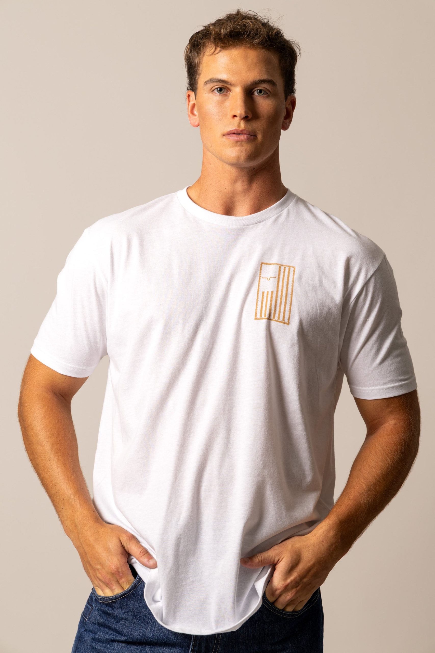 Stars. stripes. and the iconic horns. The Patched Tee brings a patriotic punch with a Kimes Ranch logo reimagined in an American flag graphic—small on the chest. bold on the back. It’s a tribute to grit. freedom. and Western roots. built on a soft. durable cotton tee that’s ready for everything from rodeo nights to holiday weekends.