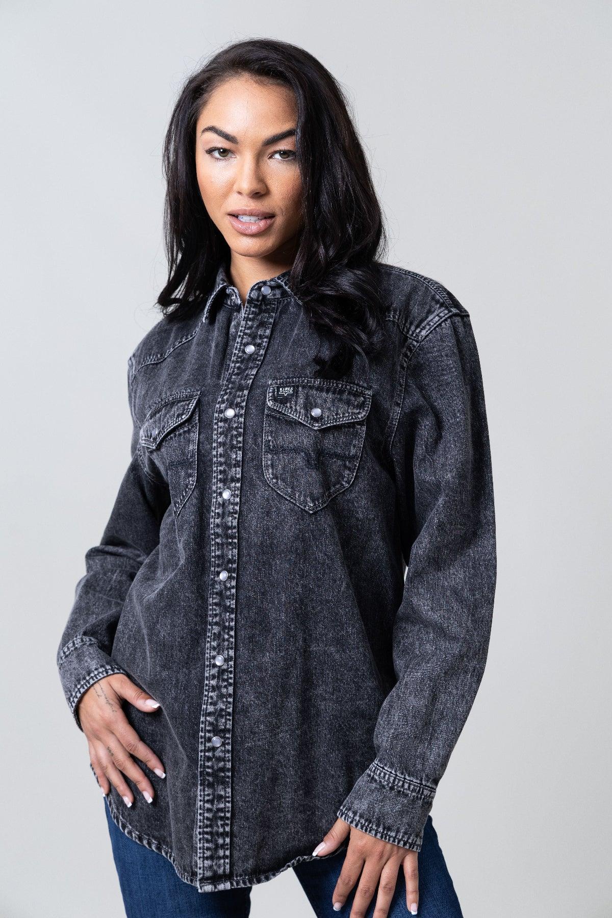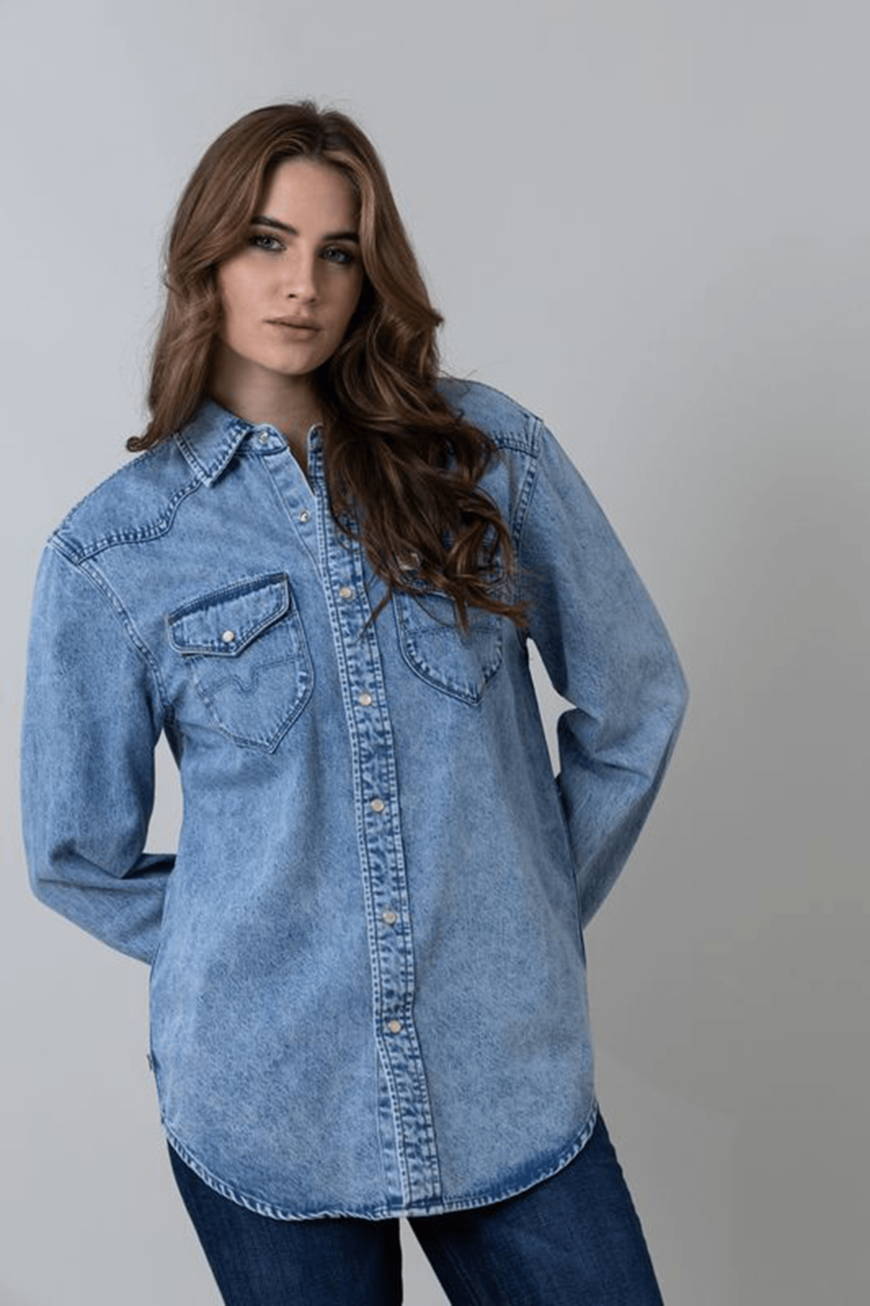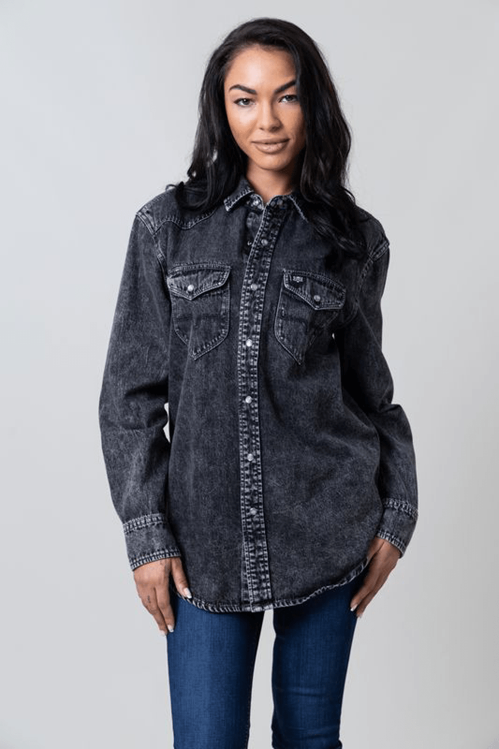Meet the Sandoval. your ideal oversized boyfriend button-down denim shirt. Sandoval exudes a lived-in feel. offering the perfect blend of comfort and style. Adorned with two front pockets and pearl snaps. it’s the ultimate addition to your wardrobe. Feel the soft. lived-in comfort and vintage charm of Sandoval. perfectly marrying practicality and style.