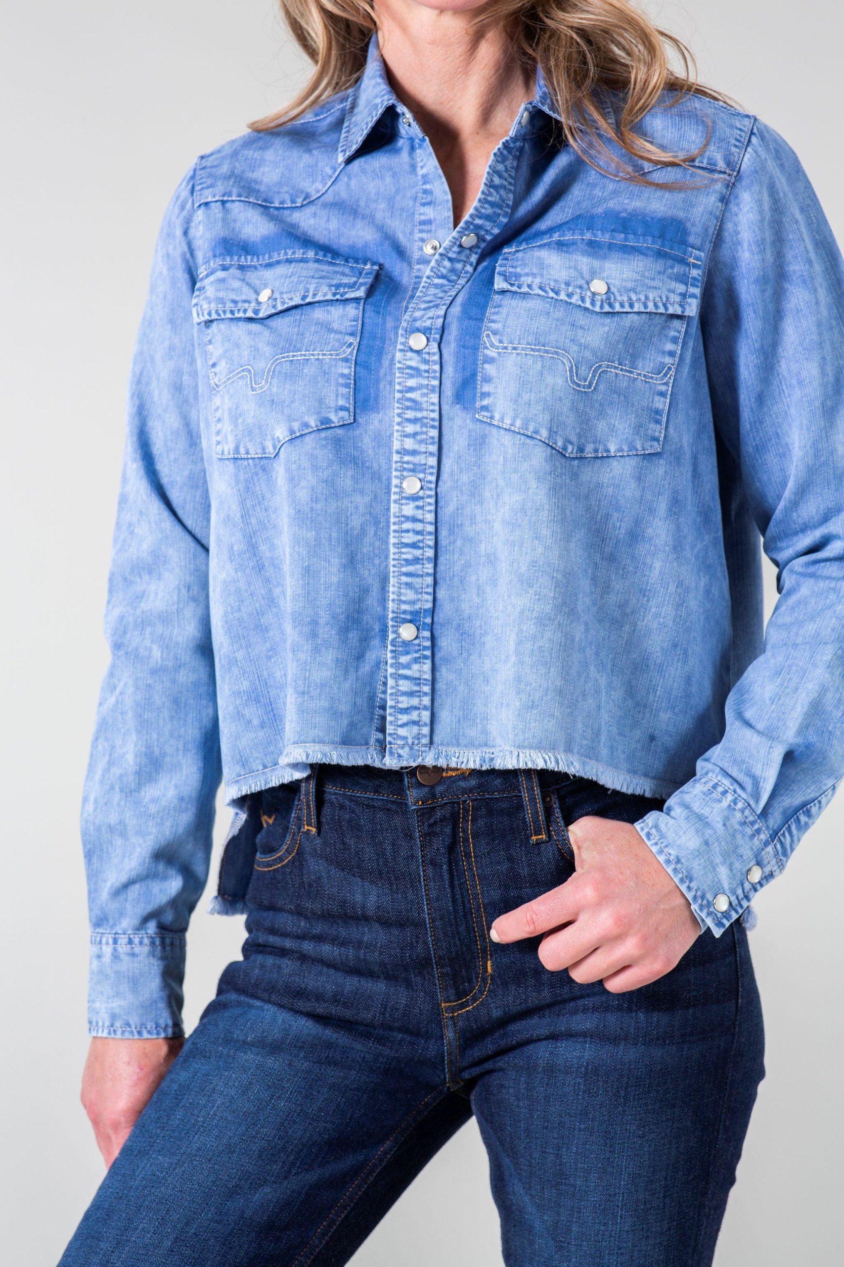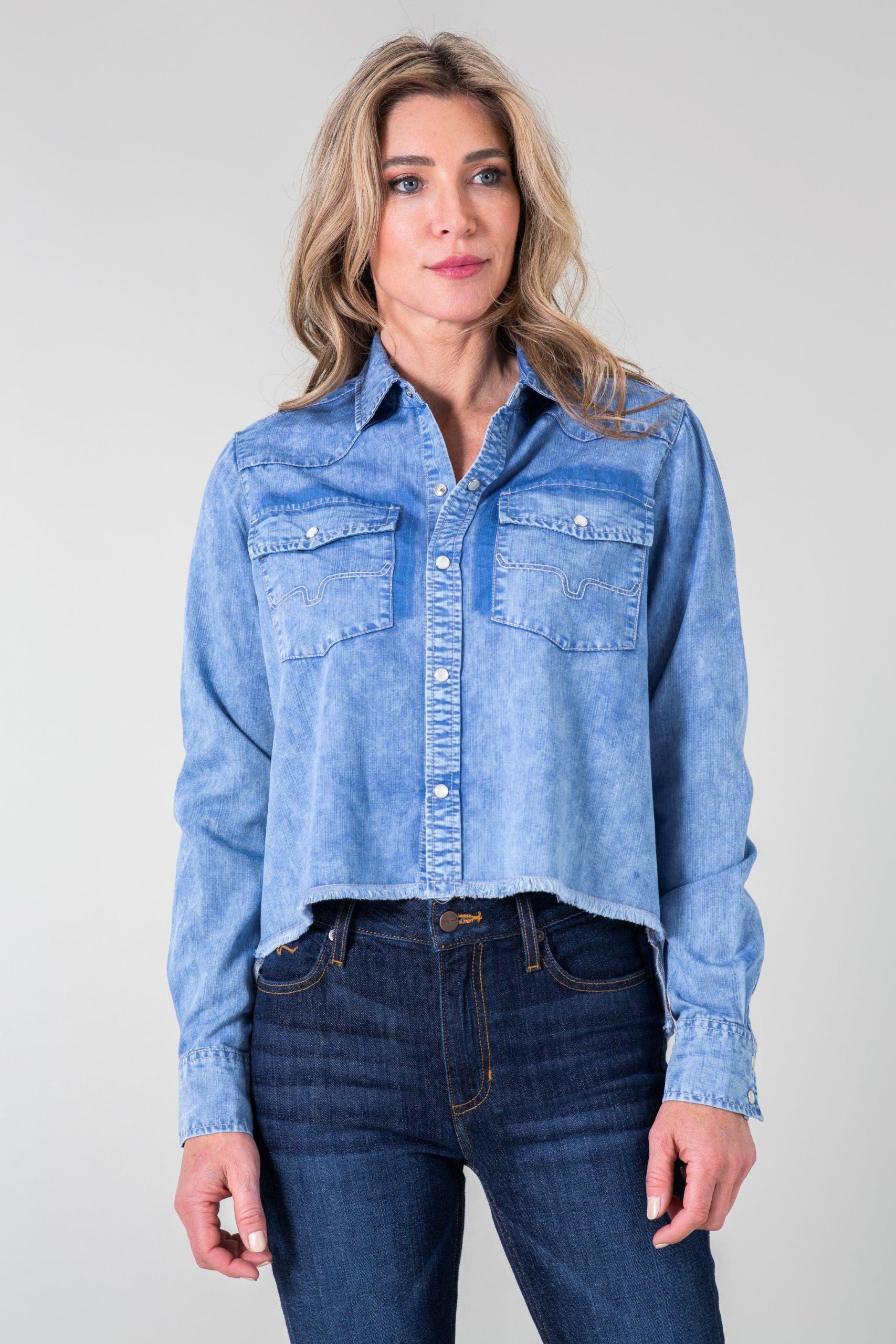 Introducing the Sundowner Hi Lo Top. a women’s Tencel shirt that blends timeless western style with modern design. Crafted from 100% Tencel. this high/low top features a cropped front and extended back for a flattering silhouette. Thoughtful details like pearl snap buttons and the iconic Longhorn logo across the chest pockets elevate its style. making it a standout piece for the modern cowgirl.