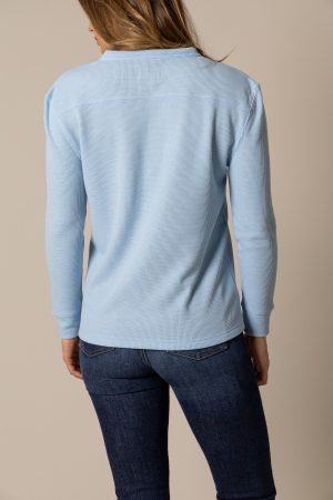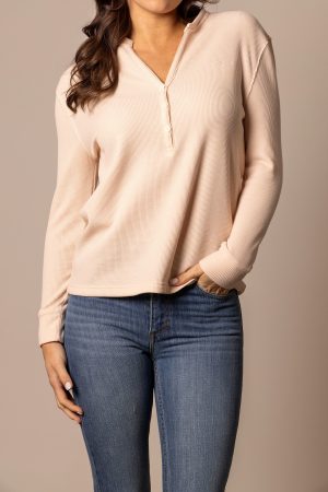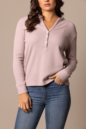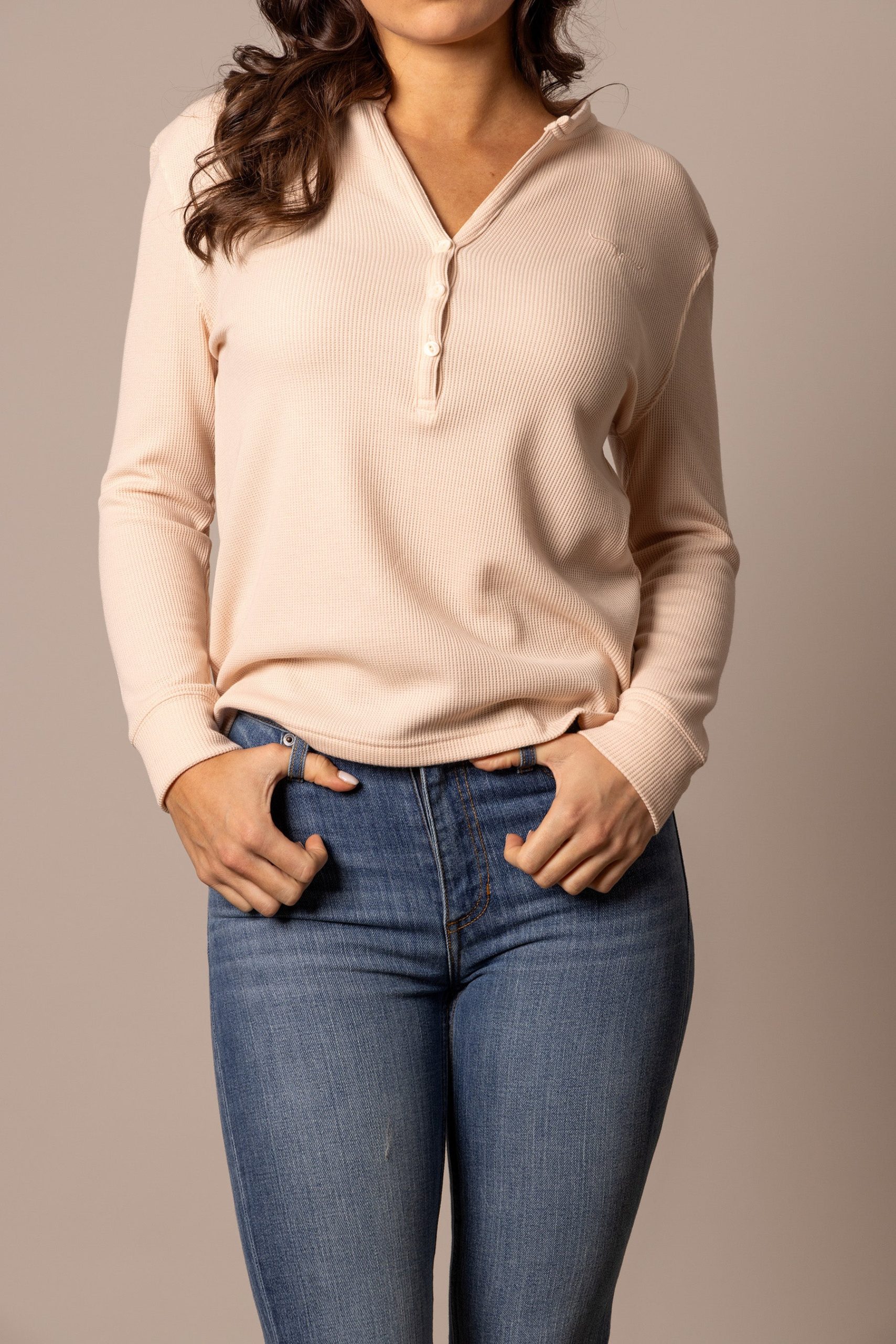 Wrap yourself in pure comfort with our Wilma shirt. Crafted from the softest waffle-knit fabric. this long-sleeve top is designed for relaxation. The split neckline adds a touch of casual style. and the subtlelonghorn logo whispers western charm. Perfect for lazy mornings. cozy evenings. or layering under your favorite jacket. this tee is your new go-to for those days when comfort is key. Live in it. love it.